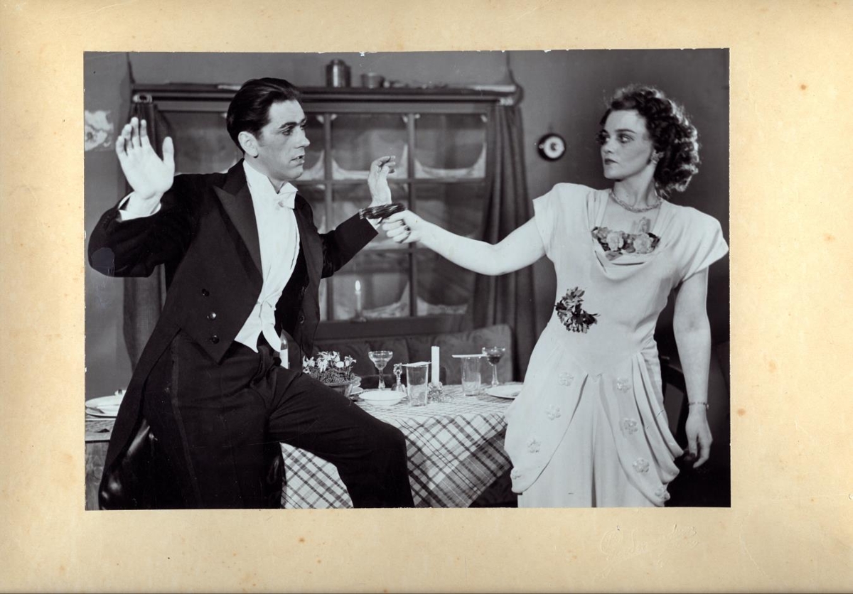 Atriði úr fyrsta verki Leikfélags Hafnarfjarðar "Ekki er gott að maðurinn sé einn". 1949-1950. Karlmaður í kjólfötum heldur höndum fyrir ofan höfðu, kona í ljósum kjól beinir að honum byssu.