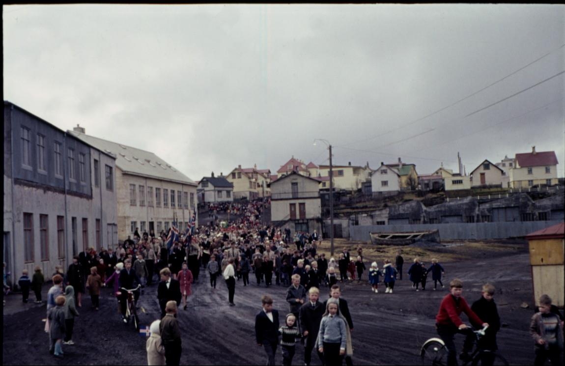 Litskyggna. Skrúðganga gengur frá Suðurgötu niður á Strandgötu. Vinstra megin er "Ásmundarbakarí" og Prentsmiðja Hafnarfjarðar. Fyrir miðri mynd er "Bristol" sem nú er Suðurgata 24 en var áður Strandgata 52.