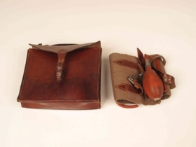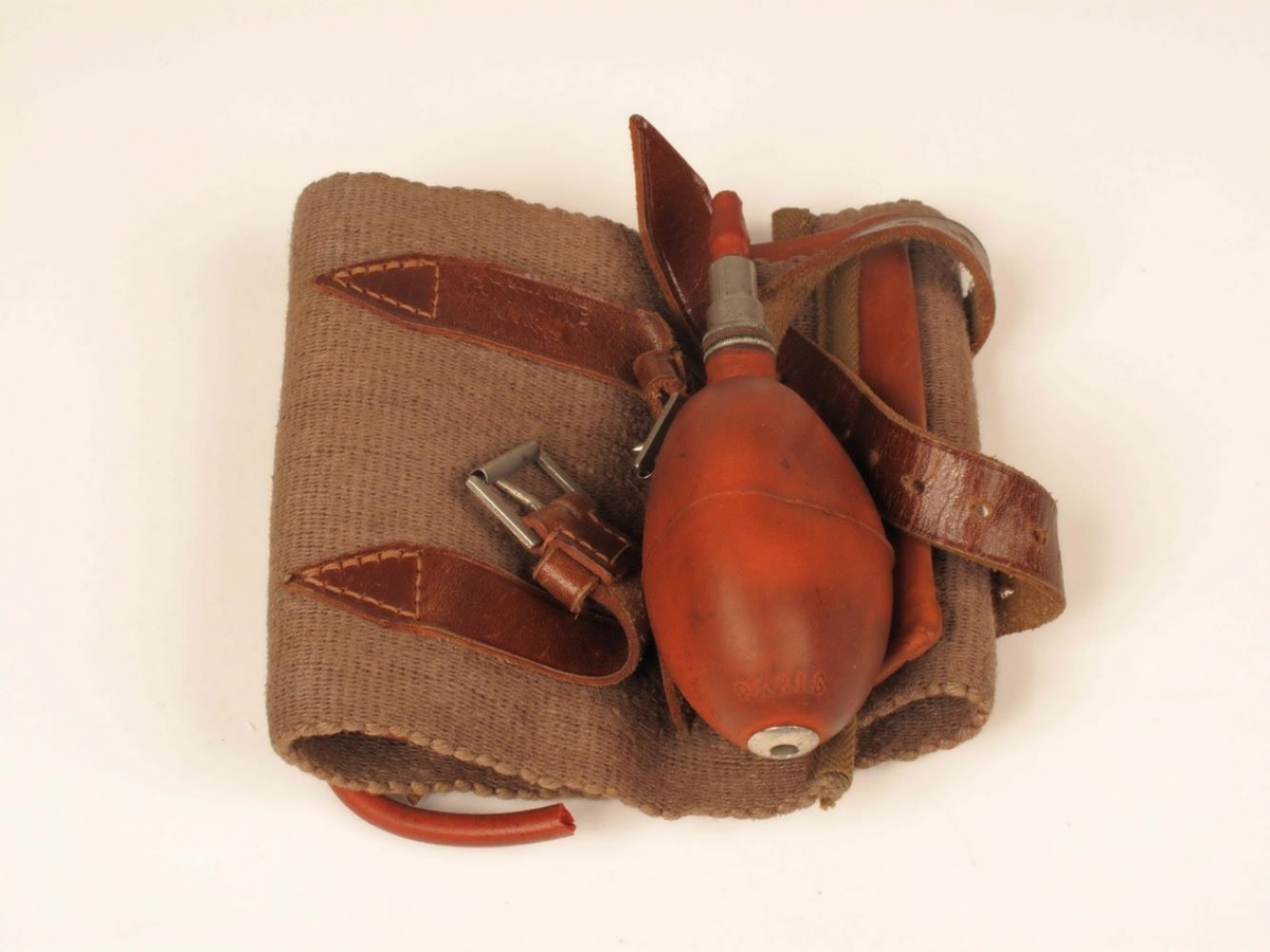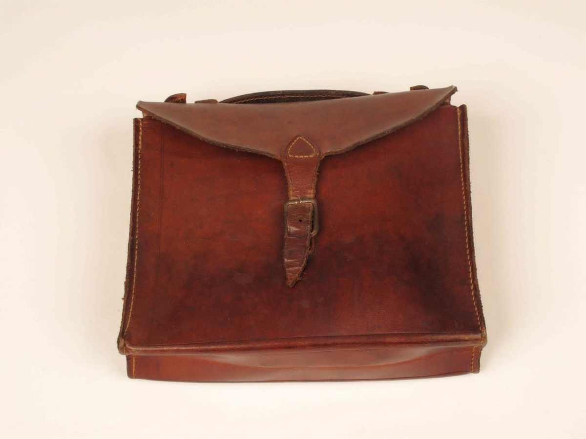 Taska úr leðri, brún. Í töskunni er blóðþrýstingspumpa.