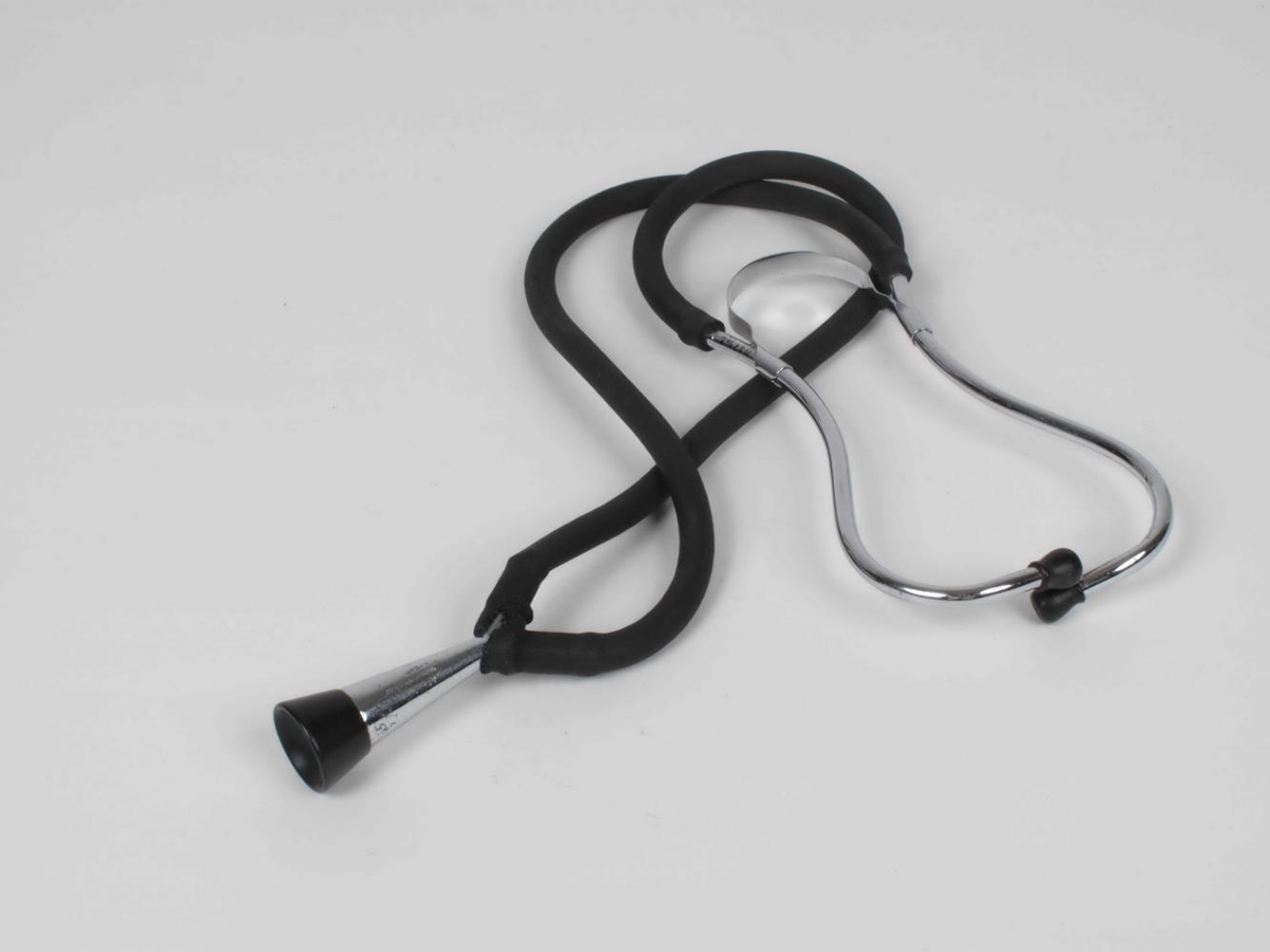 Hlustunarpípa. Með fylgir bréf: Garðabær 05.07.1997. Safnvörður Nesstofusafns, lækningaminjasafns. Í framhaldi af símtali við þig gef ég þessa gripi til safnsins. Þeir eru allir úr dánarbúi móður minnar, Láru Magnúsdóttir, sem lést í maí síðast liðinn. Bækurnar, töskuna og hlustunarpípuna átti læknanemi að nafni Georg Magnússon, en hann var bróðir hinnar látnu. Hann fæddist 16.08.1910 að Búðareyri við Reyðarfjörð og lést þann 25.01.1949 úr berklum. 2 síðustu æfiárin gat hann ekki stundað nám. Sprauturnar og nálarnar voru í eigu Láru. Um 1960 voru þær í notkun, en maður hennar sprautaði hana heima með berklalyfjum með þessum tækjum. Stólpípan var ugglaust í eigu Láru og gegnumlýsingargleraugun. Hafi einhver þessara gripa ekki gildi fyrir safnið bið ég það vinsamlegast að farga þeim. Bestur kveðjur. Georgía M. Kristmundsdóttir, Hvannalundi 12, 210 Garðabæ.