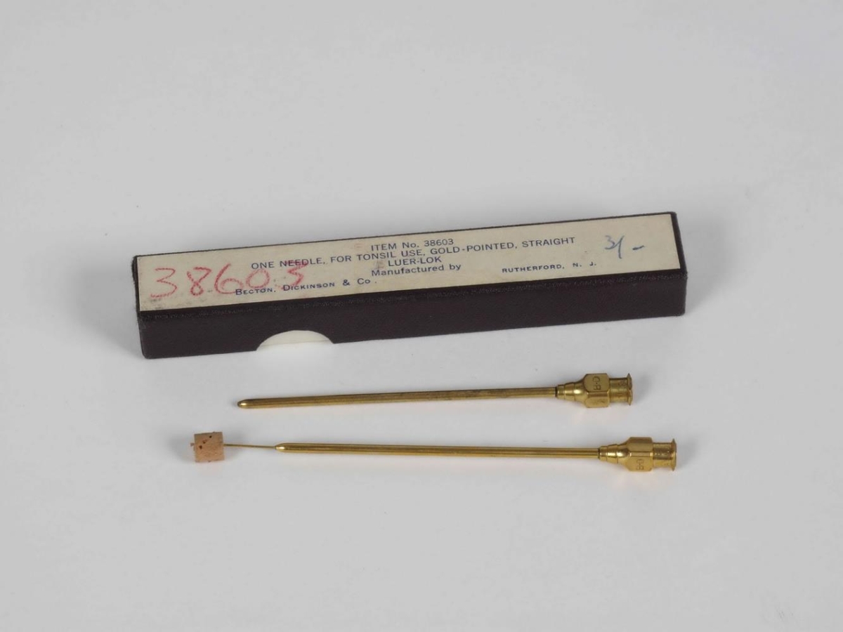 Sprautunálar. Nálarnar eru tvær saman í pappakassa, gulllitaðar og frekar þykkar. Á einni er mjórri oddur fremst en á hina vantar.