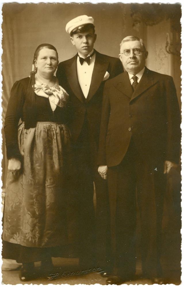 Kona og tveir karlmenn saman á uppstilltri mynd. Hjónin Svanhildur Jörundsdóttir og Páll Bergsson standa sinhvoru meign við son sinn Svavar sem ber stúdentshúfu, hann varð stúdent frá MA árið 1938.