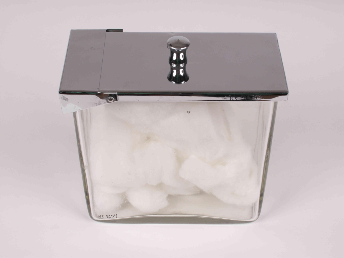 Bómullarbox. Breidd 7,5 cm, lok 18,3 cm á lengd. Gler lengd 17 cm, breidd 17 cm. í boxinu er slatti af bómull.