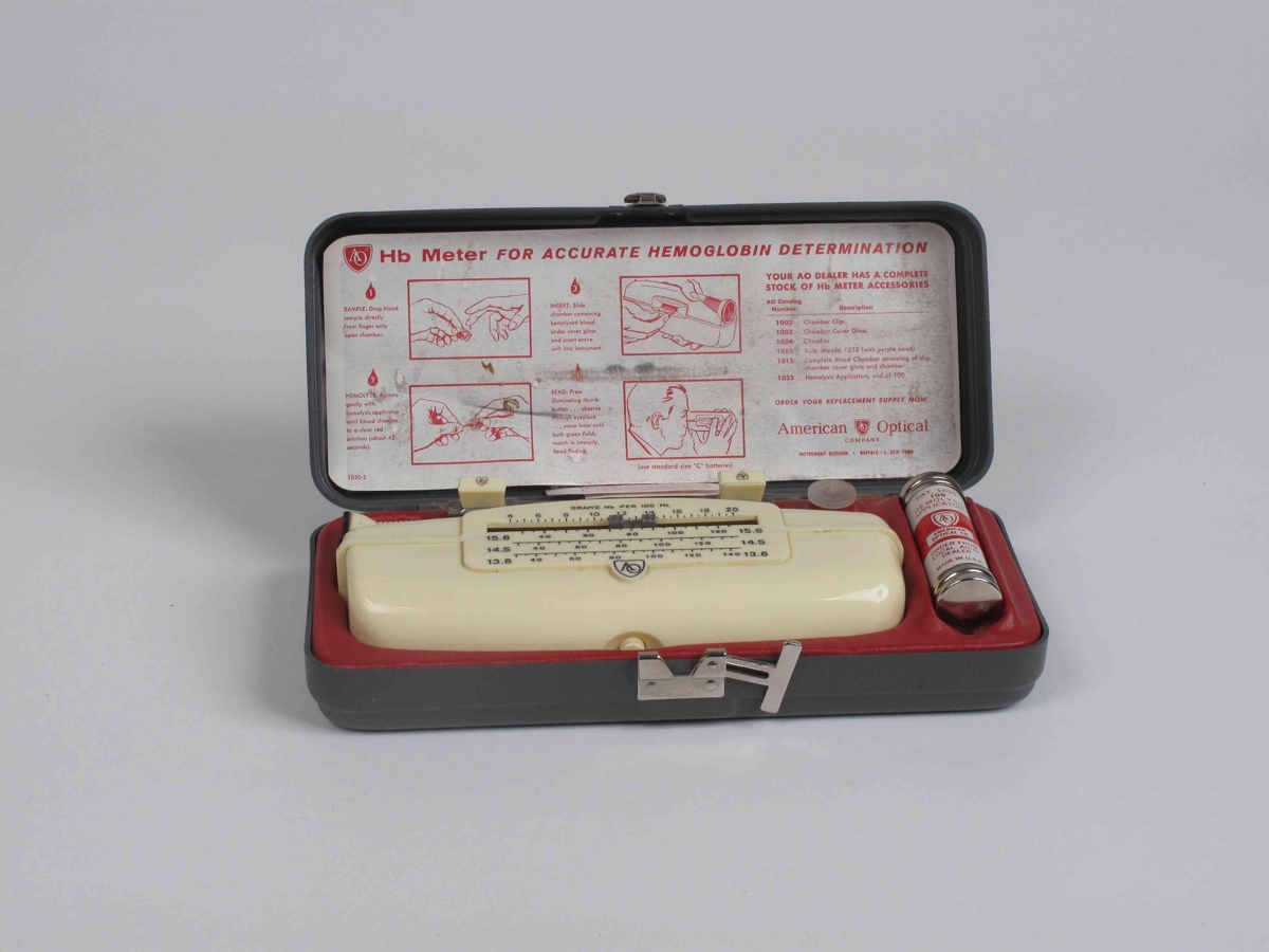 Blóðkornamælir. Notaði þegar hann var héraðslæknir í Hvammstanga. Blóðkornamælirinn er í tösku, sem er sérhönnuð fyrir hann. Mælirinn er hvítur og úr plasti og utan á honum eru mælieiningar. L=16,5 B7. Kassinn er grár að utan en húðaður með rauðu að innan. Inni í kassanum er sívalur stálhólkur sem inniheldur litla trépinna. L=7, Þ=2. Meðfylgjandi eru einnig tveir stálpinnar í bréfi. Utaná kassanum stendur Hb-Meter.