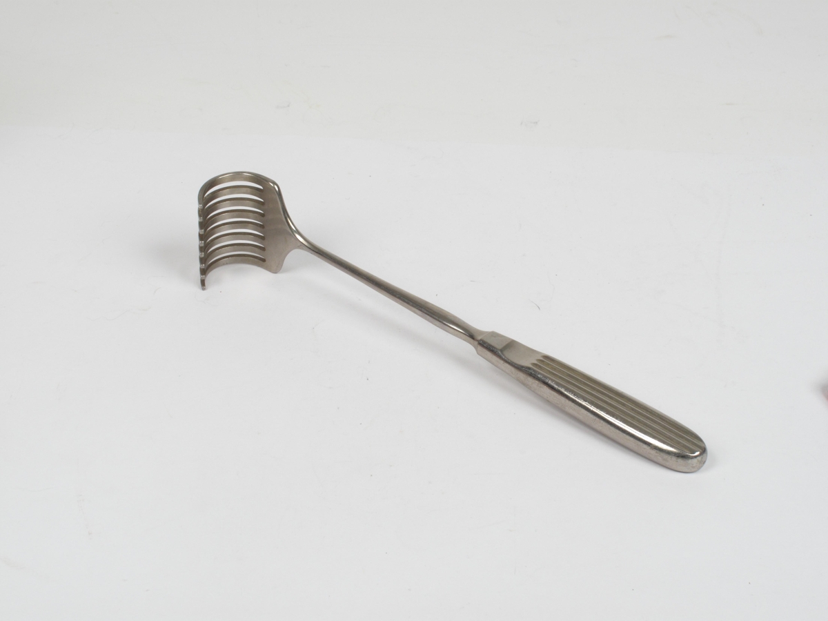 Retractor blunt. Áttálma sárahalda. Krómað. Ekkert framleðendamerki. Aesculap I, B-19768 Wandhaken nach Körte. Var meðal hluta sem fluttir voru úr Alþingishúsinu. Líklega úr Læknaskólanum.