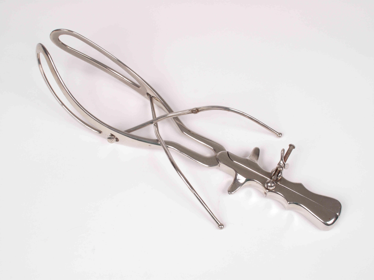 Fæðingartöng með öxuldrætti. Krómuð og ekkert framleiðandamerki. Sama gerð og NS-20. Gerð Aesculap I, F-6368 Geburtszange nach Anderson, mit Achsenzugvorrichtung. Úr eigu Bjarna Snæbjörnssonar læknis.