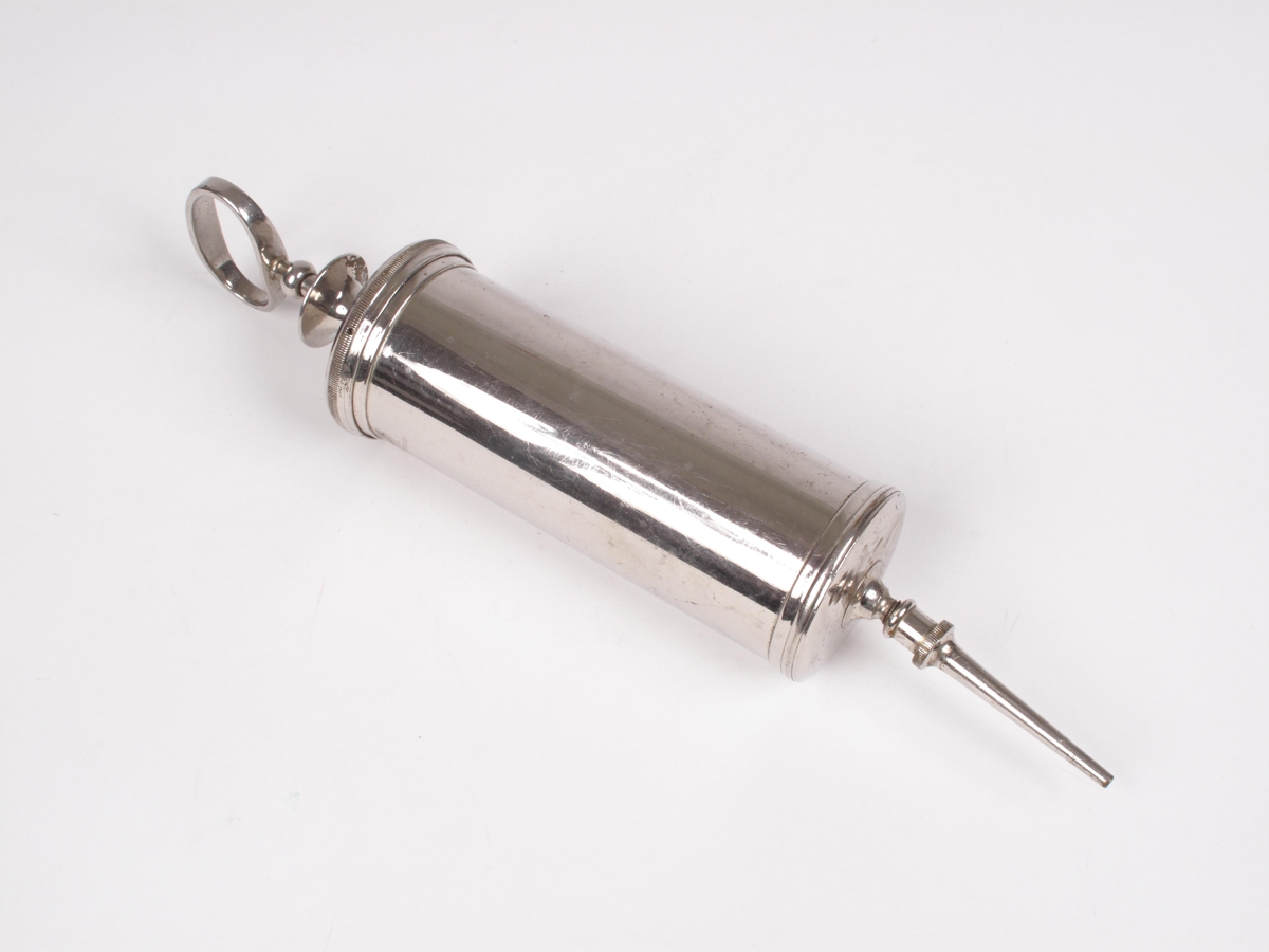 Glyserinsprauta (200 cc) úr krómuðum málmi og gradueringu á bulluskafti. Stútur með skrúfugangi. Ekkert farmaleiðandamerki. Úr eigu Bjarna Snæbjörnssonar læknis (Blöndal/Jónssonar I 1970, bls. 161).