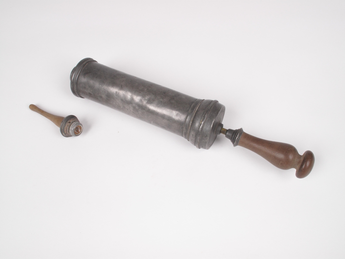 Tin stólpípa, með áskrúfuðum tréoddi og tréhandfangi. Ekkert framleiðandamerki, en er eins og C.NYROP 1864, fig. 303 bls. 200. Úr eigu Guðbjargar Sigurðardóttur. Gunnlaugur Snædal dr.med afhenti fyrir hönd dóttur hennar (Jóhönnu Hallgrímsdóttur).