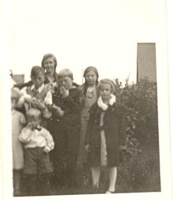 7 börn og unglingar. Aftast er Hrefna Arnadóttir, en lengst til hægri gæti verið Eyjalín Gísladóttir.
