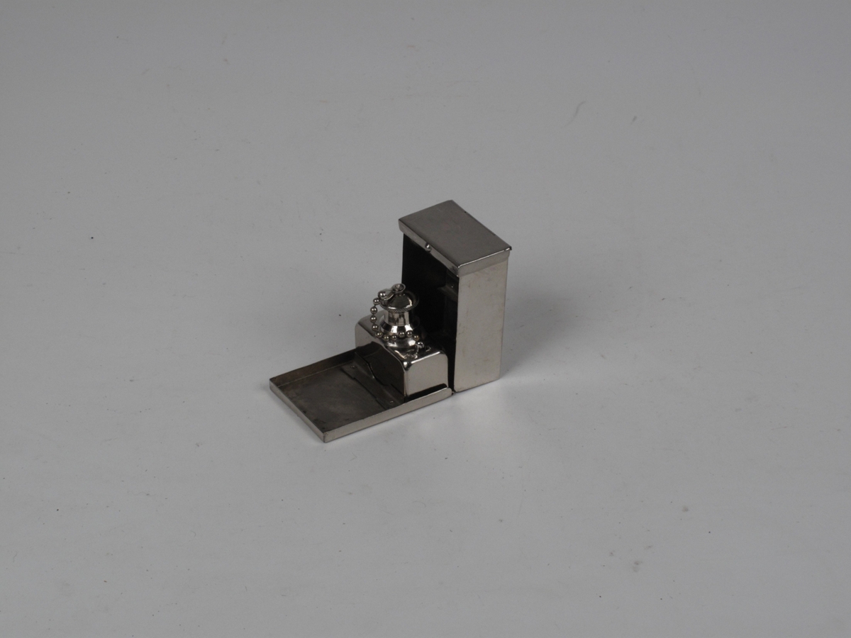 Krómað hylki með krómuðum sprittlampa í og rennulaga skál (fyrir nálar). Merkt á botni hylkis: USA/MD/PIONEER/NEW YORK, NY. Úr eigu Torfa Bjarnarsonar læknis (Blöndal/Jónsson I 1970, bls. 756). Það var áður í eigu Friðjóns Jenssonar læknis (Blöndal/Jónsson I 1970, bls. 238).