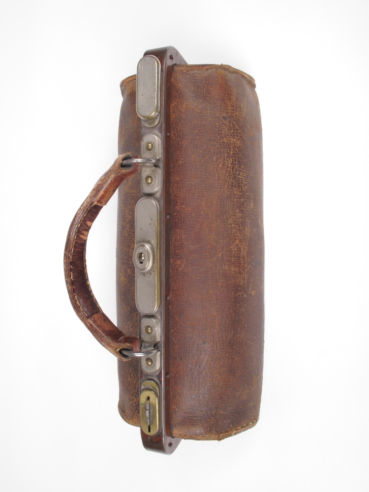 Brún leðurtaska. Læknistaska V. St. sem hann notaði alla sína læknistíð á Akureyri. Í henni eru nú 7 gleraugnahylki ásamt gleraugum, rakvél og kveikjara. Úr eigu Valdemars Steffens læknis á Akureyri. Jón Steffensen afhenti Nesstofusafni 11.05.1981.