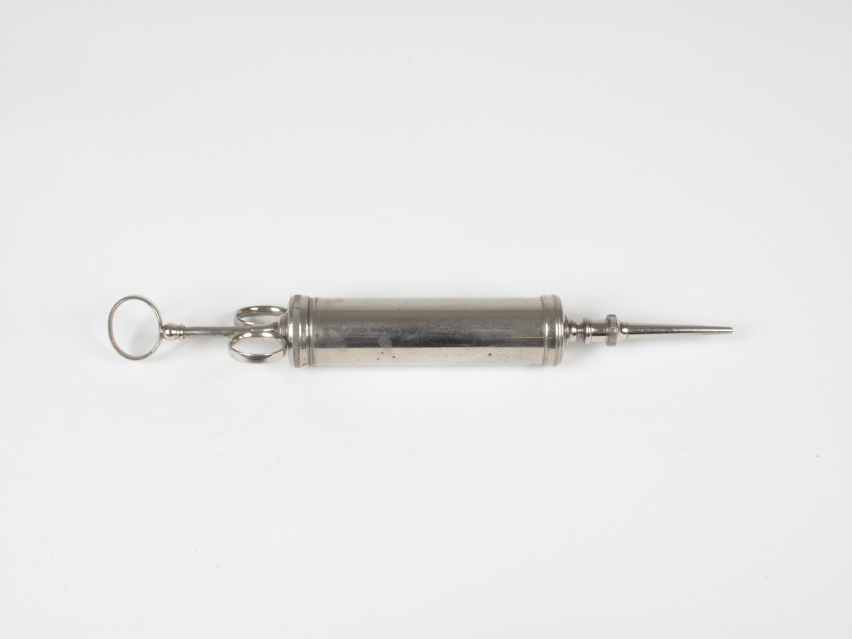 Krómuð eyrnasprauta, 50 ml. Áskrúfaður oddur. Tæki úr Elliheimilinu Grund. Valdemar Steffensen lækni gaf þau er hann dvaldi þar. Sjá: Blöndal/Jónsson I 1970, bls. 766.
