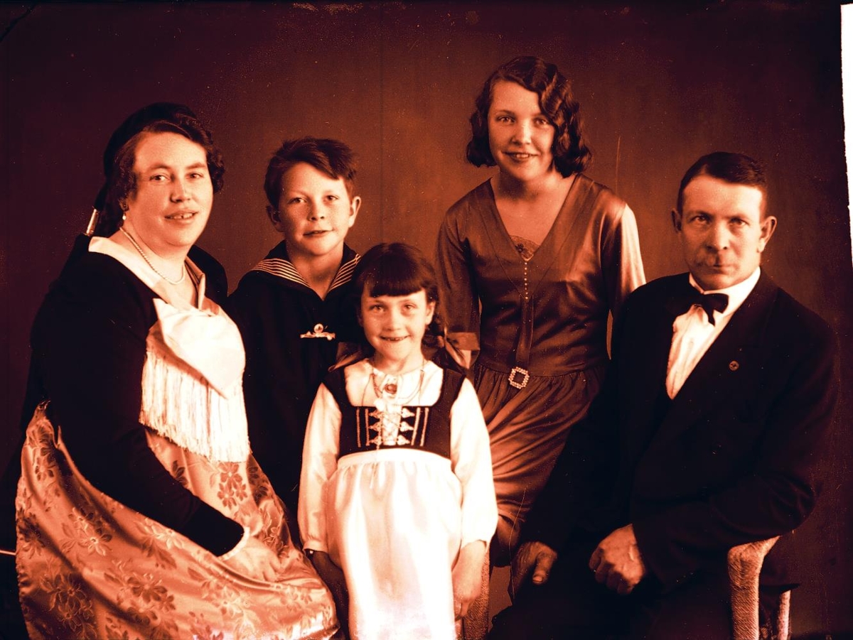 Magnús Kjartansson Syðri - Lækjargötu 18 er skráður fyrir myndinni. Á myndinni eru hjónin Sigurrós Sveinsdóttir ( f. 13. sept. 1897 ) og Magnús Kjartansson ( f. 10. nóv. 1885, d. 13. sept 1955 ) Þarna eru þau með þrjú börn með sér, tvær dætur og son. Yngri dóttirin stendur milli hjónanna og er klædd í upphlut. HJónin bjuggu í húsi sem kallað var Brautarholt.