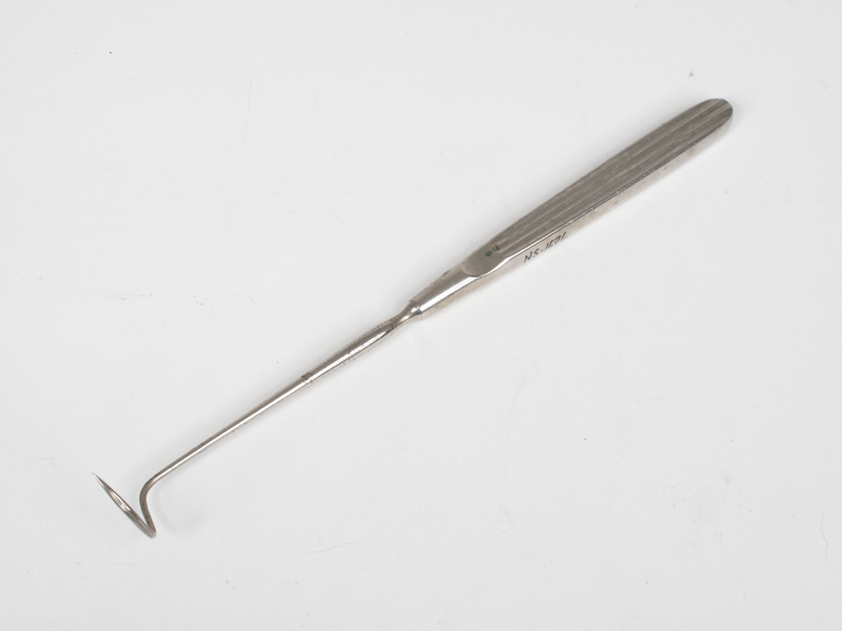 Deschamp's, beitt með vinstri bug. Ómerkt. Gerð: Aesculap I, B-4618. Komið af háalofti húss Krabbameinsfélagsins við Suðurgötu. Komið þangað frá Vík í Mýrdal. UO UF