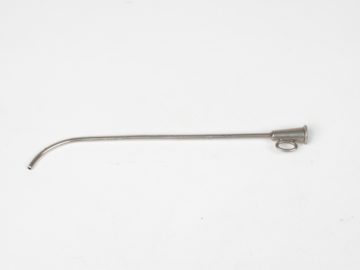 Fyrirbindingsnál Deschamp's, hvöss með vinstri bug. Ómerkt. Aesculap I, B-4618 Unterbindungsnadel nach Deschamps, scharf links gebogen. Baldur Johnsen læknir afhenti 3.10.1984. Úr geymslu L.Í. Var í NS 2143.