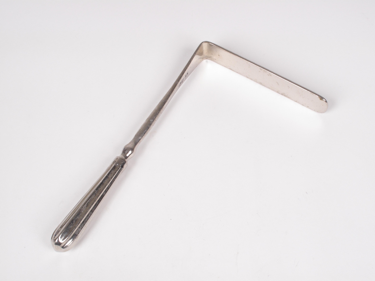 Spekulum, krómað, vinkilbeygt, slétt. Líkust: Aesculap I, F 639, ómerkt. Úr Vífilstaðaspítala.
