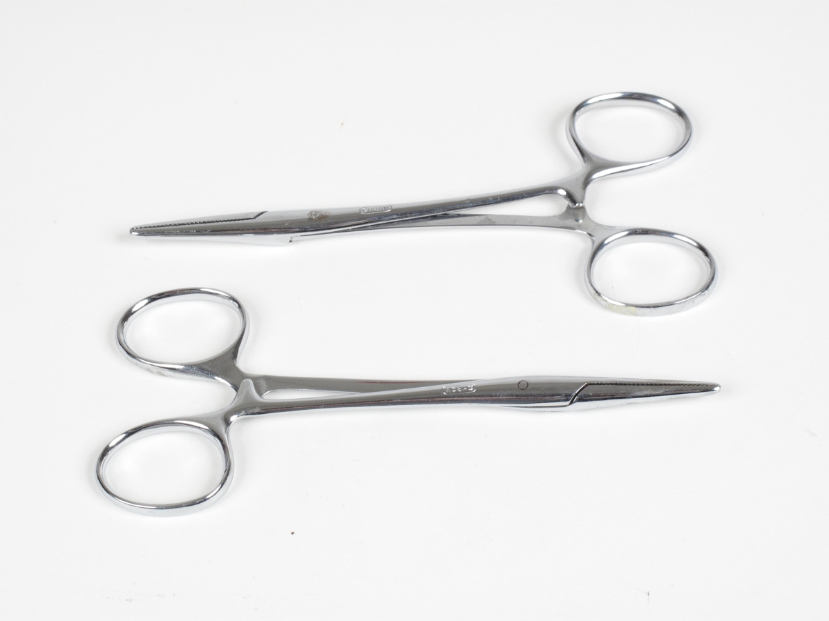 Spencer-Wells, bein. Hjörur: L. Merkt: REMEDIA HF. Aesculap I, B-17515 Arterienklemme nach Spencer-Well, gerade, 2 stk. Frá Krabbameinsfélaginu/Bjarna Bjarnasyni. Í pappakassa merktum. Stefán Thorarensen h/f.