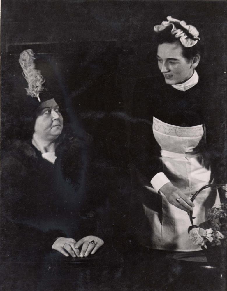 Leikfélag Hafnarfjarðar flytur skoska sjónleikinn Pósturinn kemur í leikstjórn Lárusar Sigurbjörnssonar. Svart hvít mynd. Tveir leikarar í hlutverkum sínum frá vinstri: Lilja Eyjólfsdóttir sem Frú Butt og Sólveig Guðmundsdóttir sem ráðskonan Frú Sorrel.