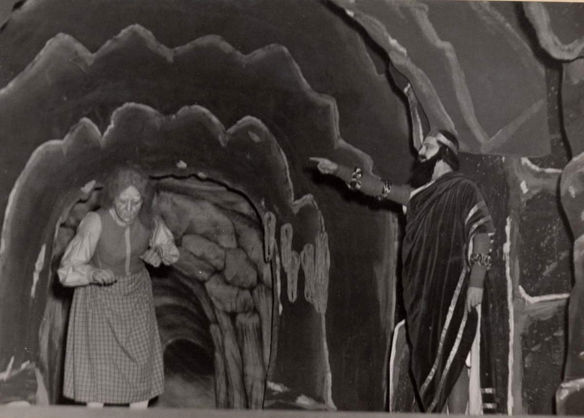 Leikfélag Hafnarfjarðar Svart hvít mynd. Tveir leikarar í hlutverkum sínum,frá vinstri:Ingibjörg Steinsdóttir og Jón Norðfjörð Nafn leikrits: Kinnarhvolssystur:Leikstjóri Einar Pálsson. Höfundur er Johannes Carsten Hauch , fæddur 1760.Hann andaðist 1872, þá áttatíu og tveggja ára.Hann var mikilsmetinn rithöfundur í Danmörku á sinni tíð. Leikritið var fyrsta verkið sem var sett upp í Bæjarbói en það var árið 1945.