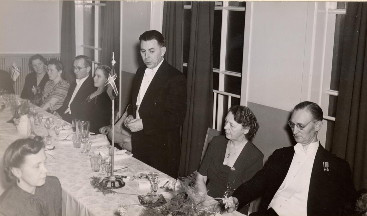 Samkvæmi í Alþýpðuhúsinu í Hafnarfirði. Gæti verið tengt Iðnskólanum eða iðnþingi ? Emil Jónsson ráðherra talar. Þriðji frá vinstri í bakgrunni myndar er Bergur Vigfússon skólastjóri Iðnskólans í Hafnarfirði