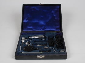 B: vinkilbeygður, krómaður ljósastaur, ómerktur, með peru. C: Augnbotnssjá merkt: MAY / OPTHALMOSCOPE / Improved / PAT No. 358766 Gowllands / Made in ENGLAND. D: 2 barkakýlisspeglar merktir: BOILABLE / MADE BY / GOWLLANDS / ENGLAND og 3 og 4. E: Krómaður munnholsspaði, ómerktur. F: Nefholssjá, krómuð, ómerkt, gerð Aesculap C-4598. G: Hluti af tengistykki með loftblástri fyrir hlustartrektir, merktur: Gowlland / Made in England. H: silkiklædd tengisnúra með krómuðum endastykkjum, ekki öruggt að eigi hér heima.