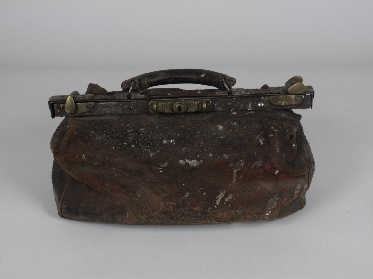 Brún handtaska úr leðri, sem öll er í málningarslettum. Þetta er lækningataska Magnúsar Péturssonar. Baldur Johnson læknir afhenti 3.10.1984. Úr geymslu L.Í. Þetta er lækningataska Magnúsar Péturssonar frá Hólmavík og síðar í Reykjavík, samkvæmt skriflegum upplýsingum Arinbjarnar Kolbeinssonar dags. 8.12.1971 er lágu í töskunni, sjá þær. Enn fremur voru í töskunni eftirfarandi tæki, sem engar upplýsingar eru um, en þau voru í tveimur pappakössum, sem reyndust og lok öskju fyrir Surgeon's Gloves og þar á ritað með rauðu bleki? Gunnl. NS 2144-