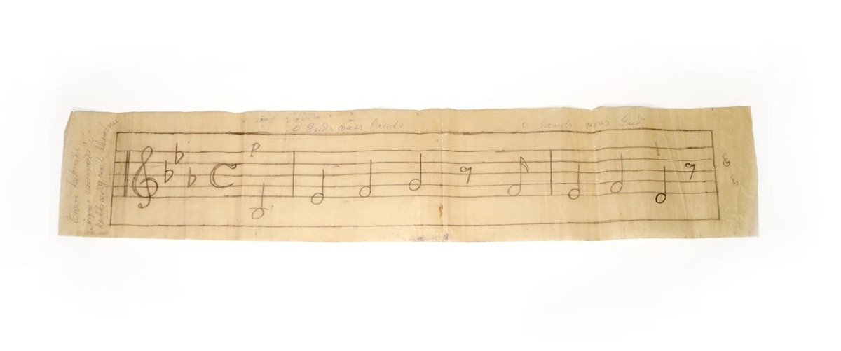 Mynsturblað til útsaums, teiknað með blýanti á smörpappír. Mynstrið er upphafsnótur Lofsöngsins: „Ó Guð vors lands, ó lands vors Guð“. Blaðið teiknaði Eðvarð Sigurgeirsson ljósmyndari fyrir systur sína, Agnesi Sigurgeirsdóttur (f. 1912, d. 1928). Agnes fékk heilahimnubólgu þegar hún var tveggja ára og missi þá heyrnina og sjónina að verulegu leyti. Agnes saumaði nokkuð út, m. a. þetta mynstur og sendi til systur sinnar Hermínu, sem þá var við nám í Kaupmannahöfn. Agnes og Eðvarð voru föðursystkin gefanda, Erlu Gunnarsdóttur. Þegar Erla var á ellefta ári (1941) gaf föðuramma hennar, Júlíana Friðrika, henni ýmislegt handavinnutengt sem verið hafði í eigu Agnesar, þar á meðal mynsturblöð nr. Þjms. 2015-56-1 og 2.