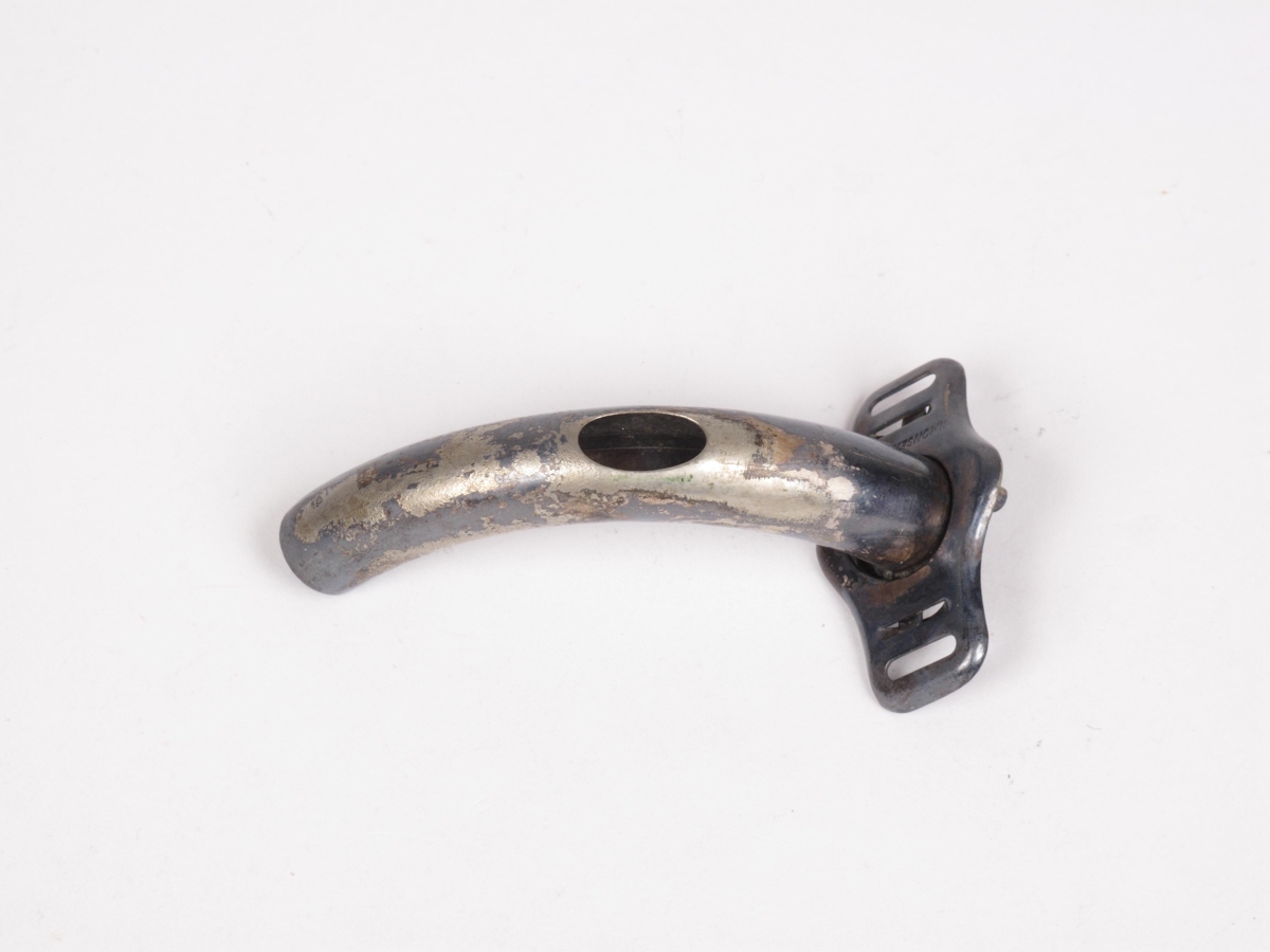 Barkapípa Luer's, með ávölu opi á bug, úr nýsilfri, merkt: SIMONSEN & WEEL 8, (innri pípu vantar). Aesculap C-10885 Tracheaæ-Kanüle nach luer mit Öffn in Rück, (sjá NS-1420).