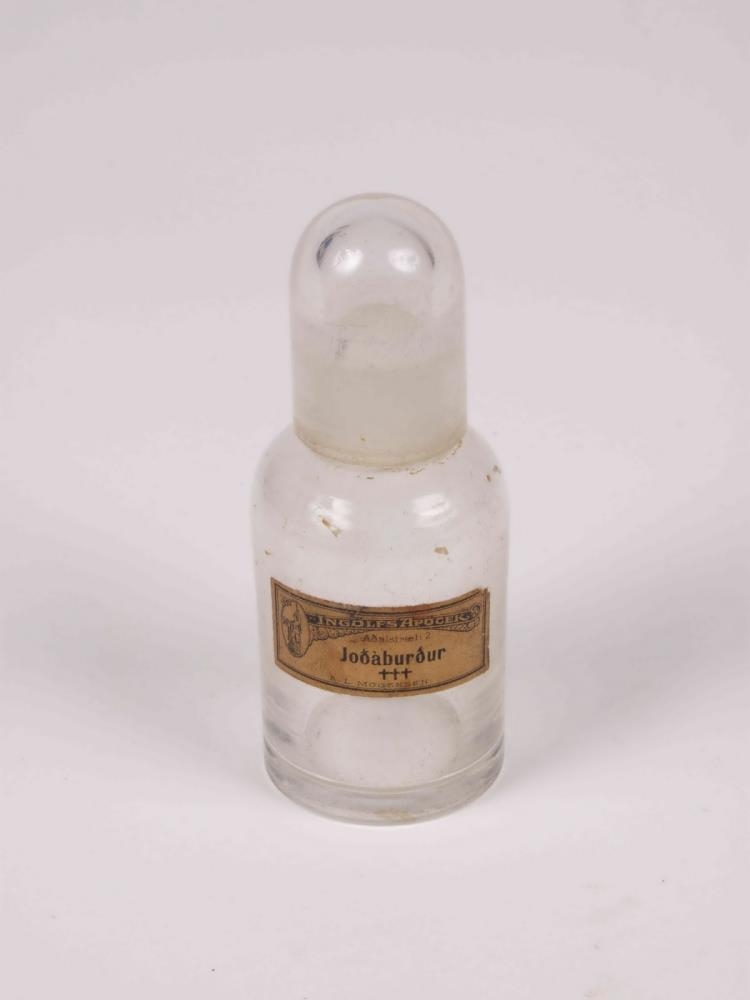 Lyfjaglas, sívalt, ólitað, með áslípaðri glerhellu og merkimiða Ingólfs Apótek/ Aðalstræti 2/ Joðáburður ttt/ P.L. MOGENSEN. Það var des. 1928-1947 undir stjórn P.L. Mogensen.