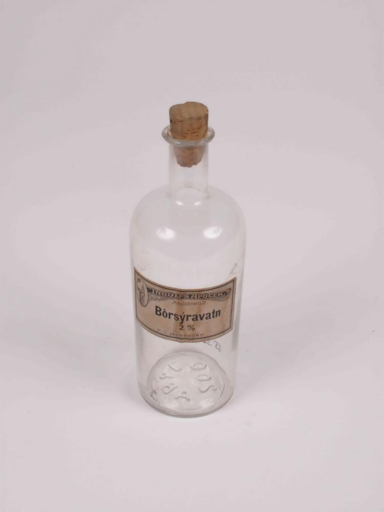 Lyfjaglas, sívalt, ólitað, með korktappa og daufbláum merkimiða Ingólfs Apótek/ Bórsýravatn 2%/ P.L. Mogensen. Á botni glassins: 200/ AB & C.