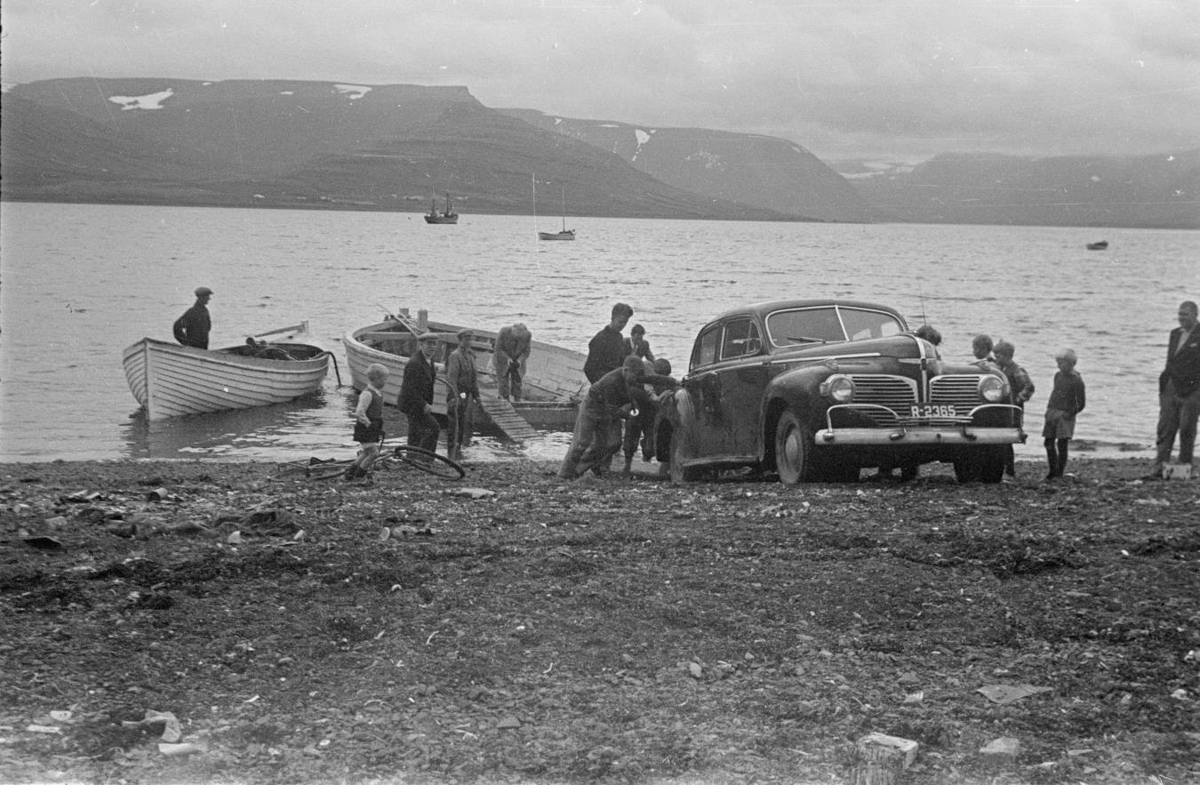 „Myndin er örugglega frá Þingeyri, horft er inn fjörðinn og blasir Höfðinn við handan fjarðar. Bíllinn er að koma úr "Ferjunni", bát með fellanlegum skut sem brúkaður var til stórflutninga um Fjörðinn. Má vera að báturinn til vinstri sé Gemlufallsbáturinn er sinnti ferjun þverfirðis. "Holdning" mannsins sem um borð stendur þar sem og gerð bátsins minnir mig meira á Þorvald Kristjánsson frá Svalvogum, sem um árabil sinnti snatti sem þessu á þingeyri. Þetta er ekki "Pakkardinn" - forsetabíll Sveins Björnssonar, sem þarna er draujað í land? Það vita kunnugir, og númerið má líka sjá á frægri mynd Vigfúsar(?) af honum á Þingeyrarbryggju - þar sem Ólafur Ragnar stendur smár pjakkur á Eyrinni fyrir framan hannn“ (BG 2019)