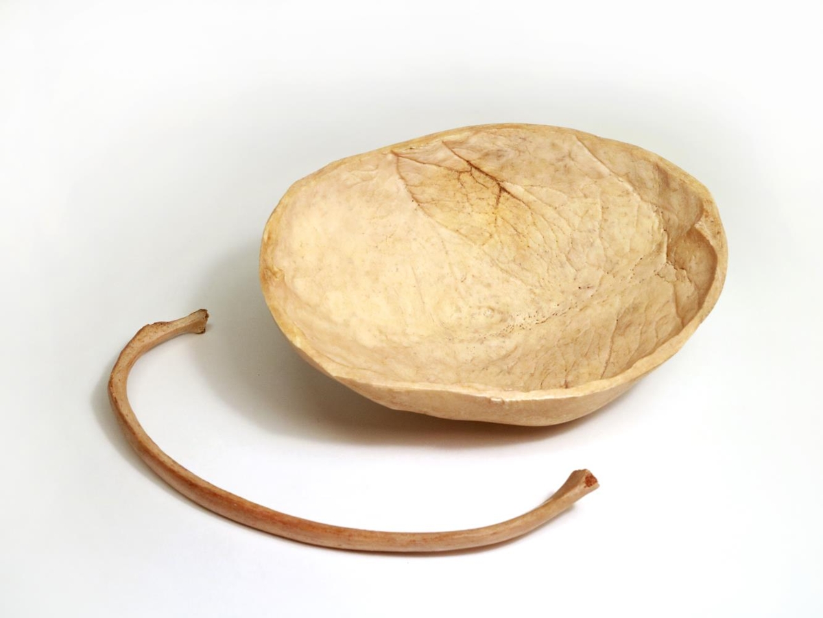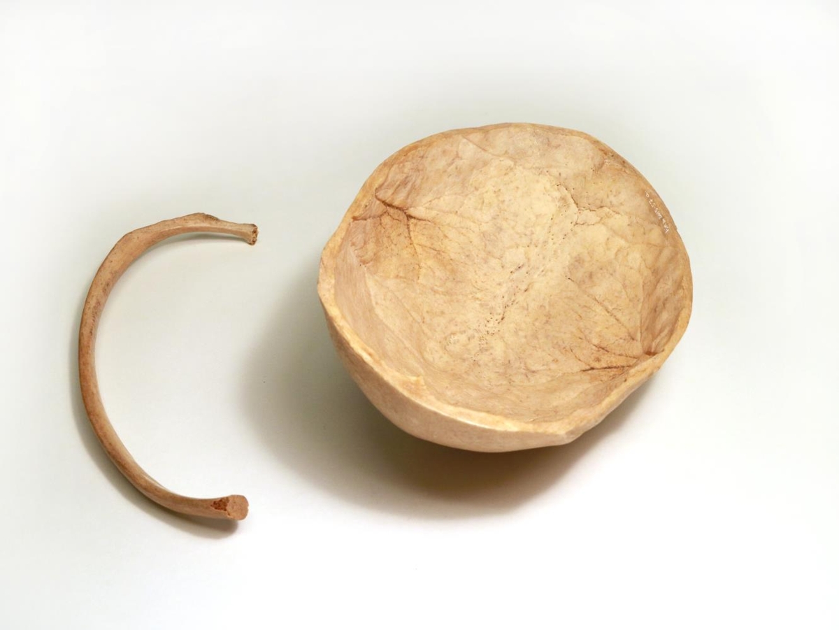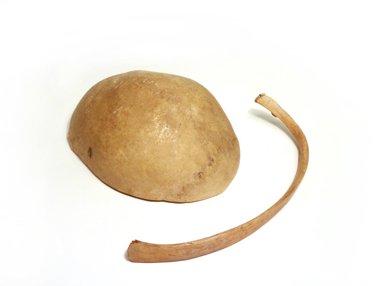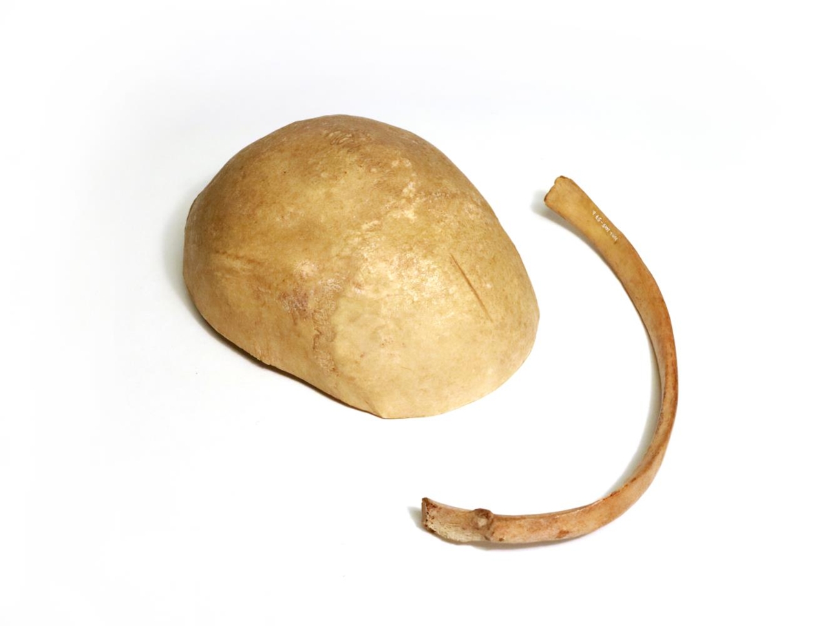 Mannsbein: annars vegar efsti hluti höfuðkúpu (a), afsagaður, og hins vegar eitt rifbein (b). Saga beinanna er sú „að Hallgrímur Þorsteinsson [f. 1864, d. 1952], organisti og söngkennari, réði sig sem húsvörð við Menntaskólann í Reykjavík á árunum kringum 1920. Hann átti þá gamalt skrifborð, sem hann lánaði tveimur ungum læknanemum. Þegar þeir skiluðu borðinu voru umrædd bein í einni skúffu borðsins. Hallgrímur bað þessa ungu menn að sækja beinin, sem þeir lofuðu að gera en gerðu ekki. Beinin hafa því legið í þessu skrifborði, allar götur síðan. Það voru ströng fyrirmæli frá Hallgrími að ekki mætti fjarlægja beinin. Borðið endaði í eigu [gefanda] á áttunda áratug síðustu aldar, en fer nú í vörslu annars staðar. Því viljum við losa okkur við beinin og höfum beðið [Þjóðminjasafn Íslands] að taka við þeim til varðveislu.“ (Upplýsingar fengnar frá gefanda).