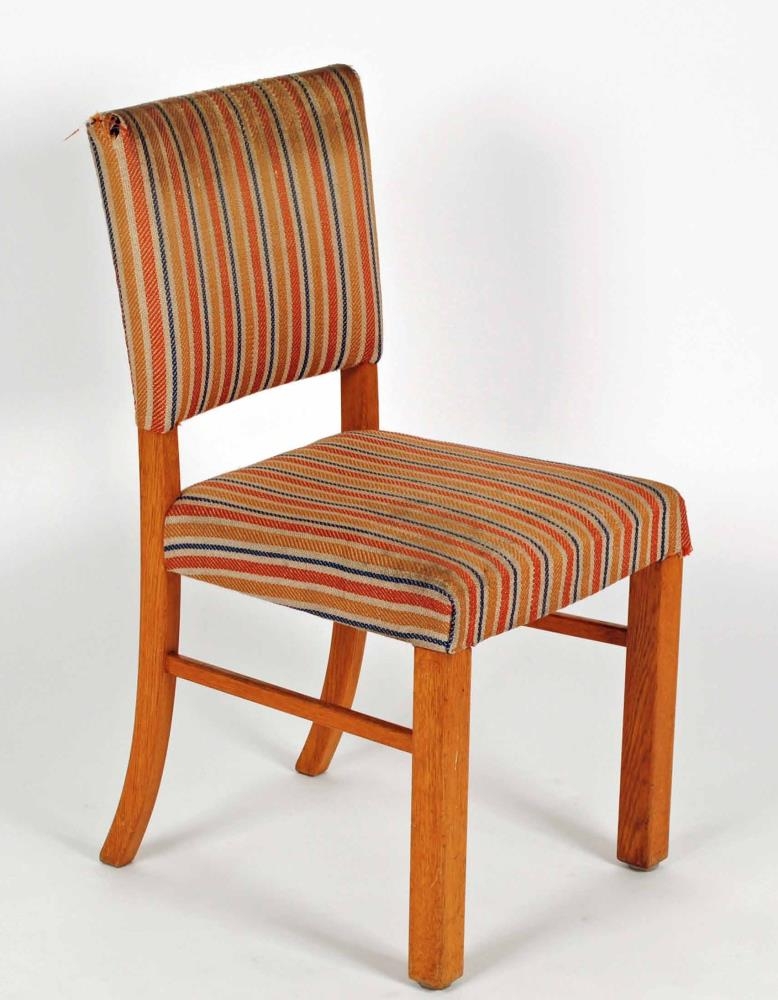 Smíðaður úr eik með handofnu ullaráklæði. Áklæðið var ofið á Vefstofu Ernu Ryel, Austurstræti 17.
