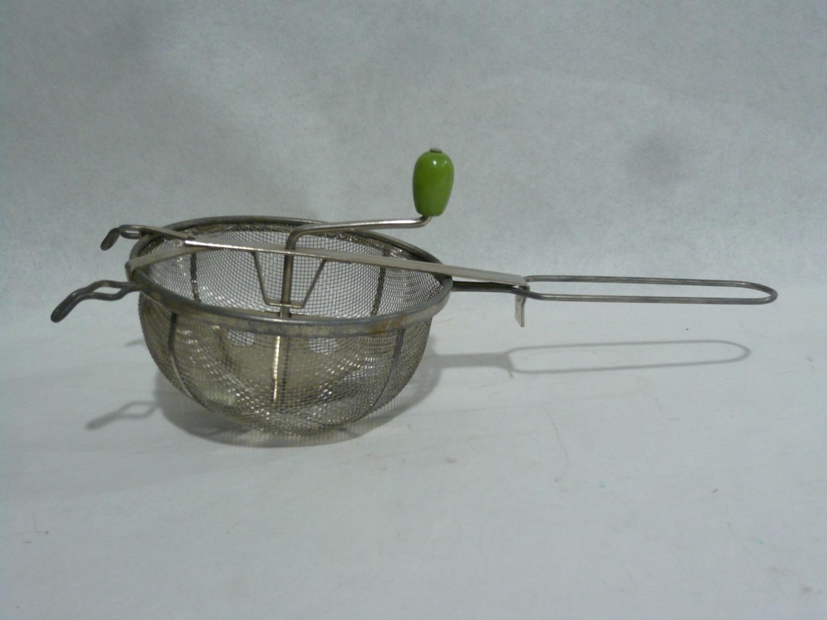 Hveitisigti með fínriðið net úr málmi og þar innaní spaði sem hægt er að snúa með sveif. Dýpt er 8 cm, þvermálið 16 cm og andfangið er um 17 cm langt. Framleitt í Englandi.