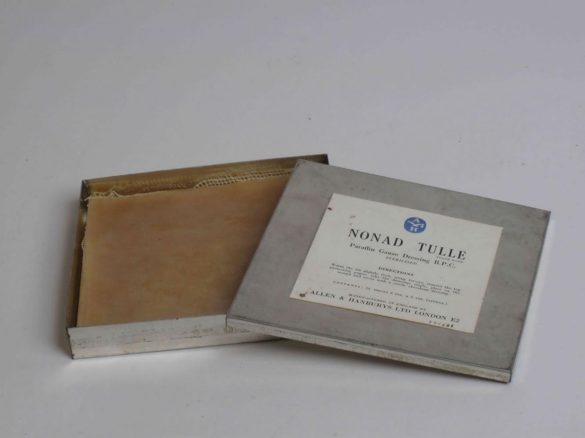 Sjá NS-4522. Málmkassi (Lengd: 15.9 cm, breidd: 15.7, hæð: 2.4 cm). Í kassanum eru vaxborin grisju-stykki, um það bil 15.2 x 15.2 cm. Í kassanum hafa verið 36 stykki en erfitt er að segja hversu mörg eru eftir. Stykkin átti að hita lítillega og leggja svo yfir sár. Á miða á loki kassans eru leiðbeiningar.