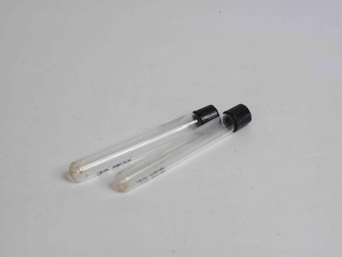 Sjá NS-4522. Langt og mjótt glerglas með áskrúfuðum svörtum plasttappa.