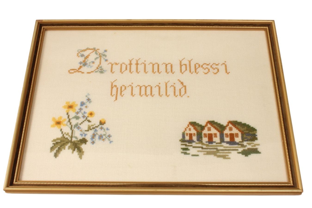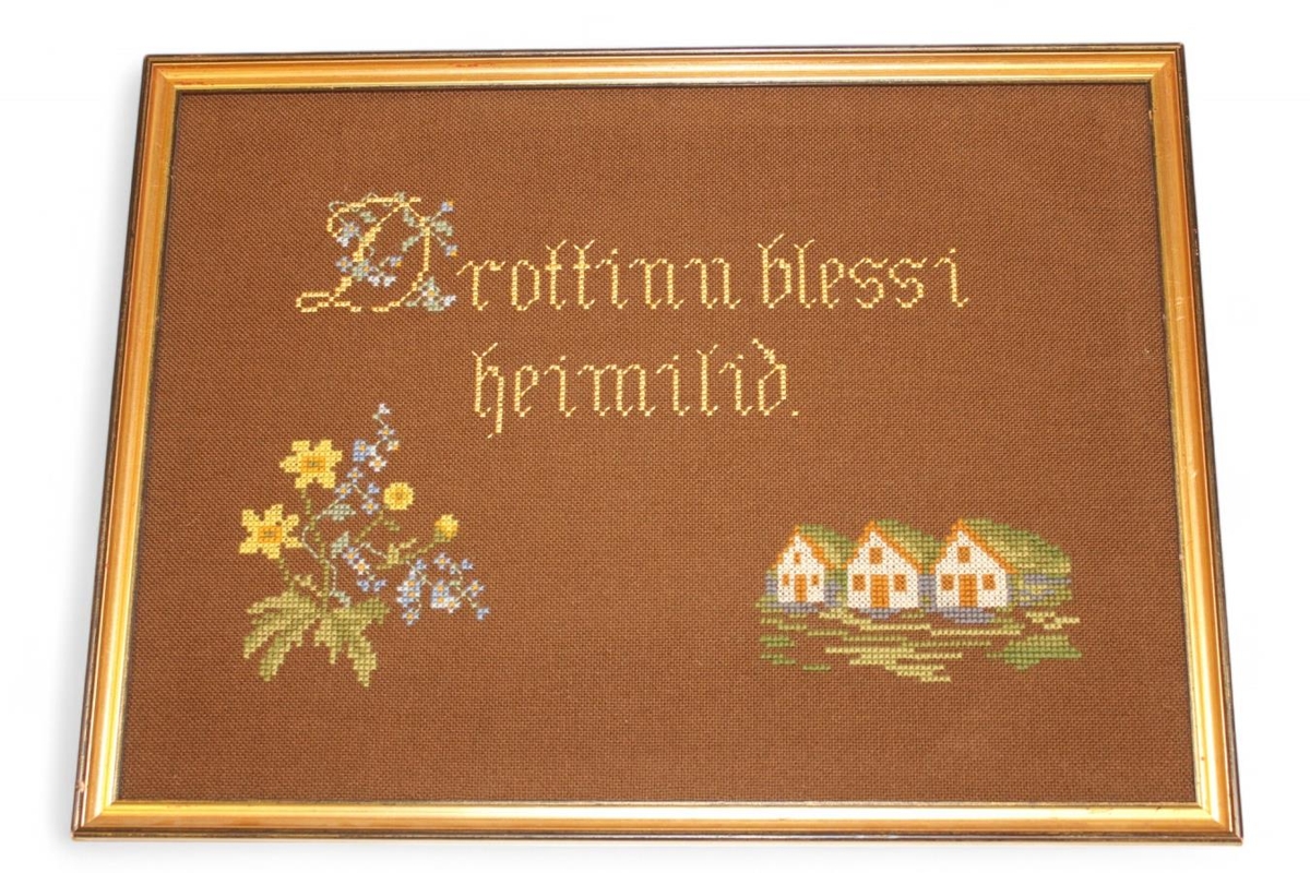 Útsaumsmynd, Drottinn blessi heimilið. Krosssaumur, saumað í brúnan ullarjava. Burstabær og blómvöndur.