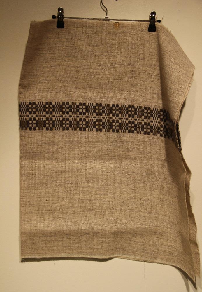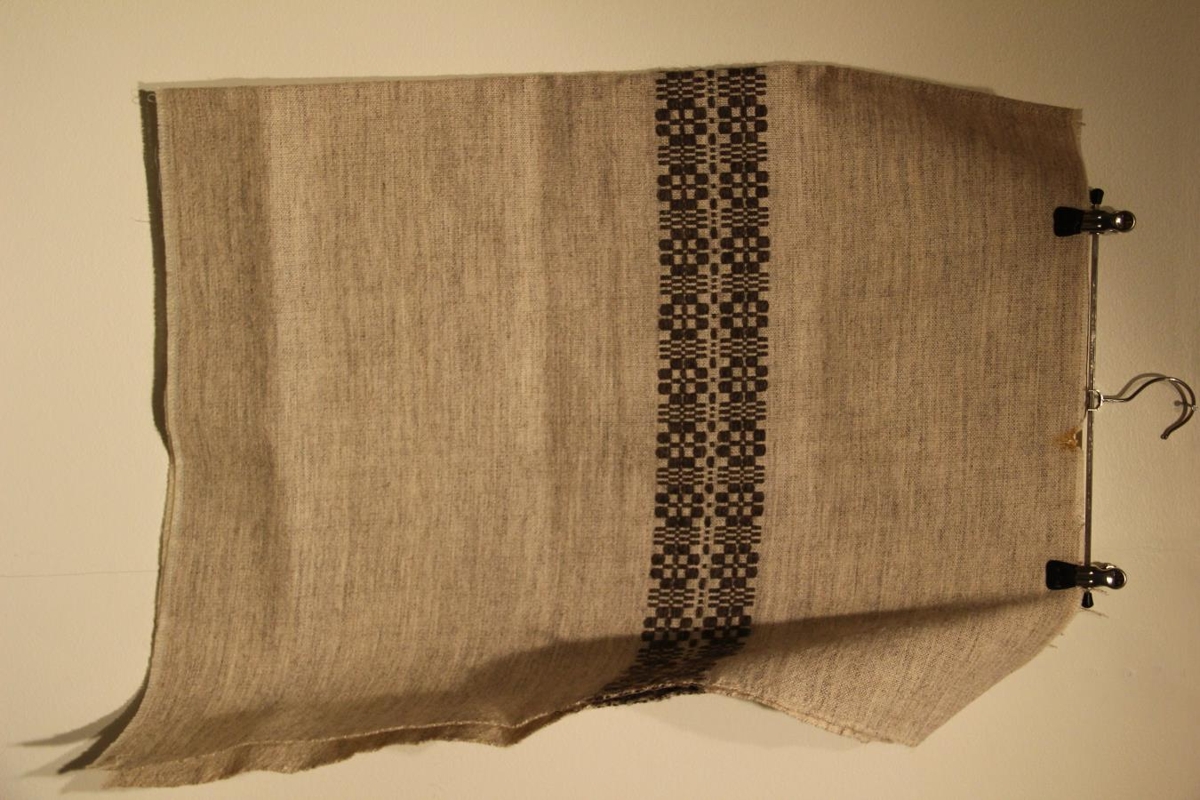 Litur ljósgrár, grunnur með dökku munstri. Efnið er handofið af Vefstofu Karolínu Guðmundsdóttur í Reykjavík. Hún óf úr Gefjunarbandi alla tíð, um áratuga skeið. Efnið er loðbands-eingirni.
