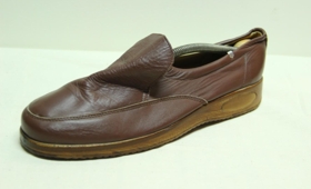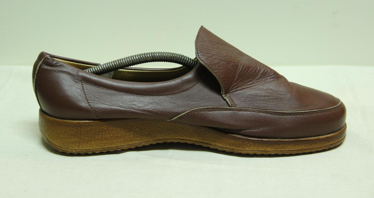 Brúnn skór með teygju og hrágúmmísóla. Merki: ACT. Stærð 44.