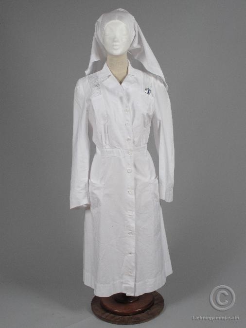 Kjóll úr bómullarefni sem virðist vera sami kjóll og fyrsta forstöðukona Landspítalans Kristín Ólína Thoroddsen (f. 29.apríl 1894 d. 28.feb. 1961) er í á mynd frá 1930, stærðin er 44 . Gæti verið heimasaumaður. Snið er svipað og á kjólum frá þessum tíma. Tekinn í sundur í mittið með líningu. Fín lek saumuð frá axlarstykki og niður að brjóstvasa. Brjóstvasar eru tveir á hægri boðung er vasinn mjór a.ö.l. ætlaður fyrir penna. Pils er útsniðið í 6 stykkjum. Hnepptur niður að framan. Ermar langar með uppslögum og útvíðar neðst og hneppt. Flibbakragi sem hægt er að næla upp í háls. Blæja var borin við hann 2007-43.