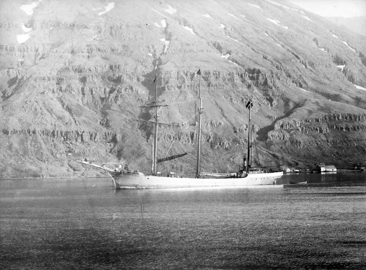 Þriggja mastra skútan "Maija" á Seyðisfirði. Danskur fáni blaktir á aftasta mastri. Bak við skútuna sjást hús.
