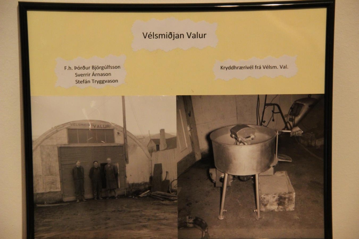 Tvær ljósmyndir frá Vélsmiðjunni Val á Akureyri. Önnur af þremur starfsmönnum fyrir framan vélsmiðjuna. Hin myndin er tekin inni í vélsmiðjunni.