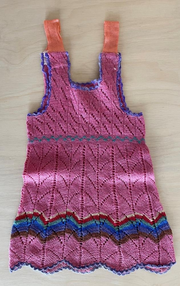 Saga: Gefandi, Erla Jakobsdóttir, fékk þessa klukku frá Sigurlaugu ömmu sinni. Algengt var að hafa flíkur vel við vöxt. Einnig að lengja í hlýrum eins og gert er við þessa.