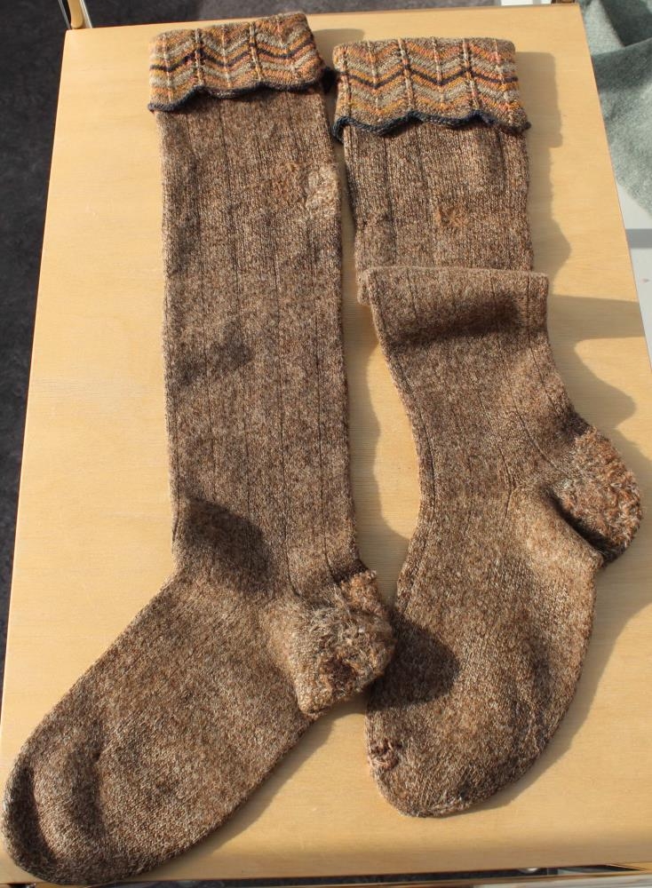 A og B. Mórauðir með uppábroti, á því eru grænar og svartar rendur. Stoppað í hæla og tær.