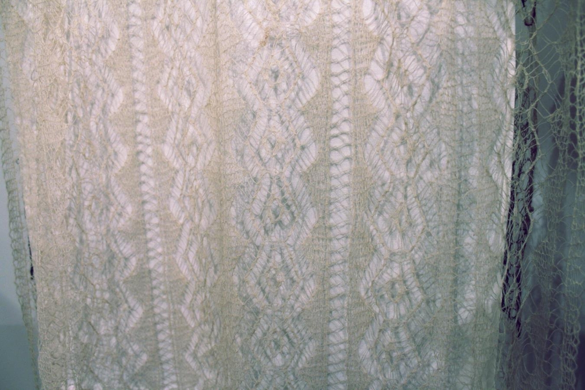 Saga: Fyrsta fína sjalið sem Jóhanna Jóhannesdóttir (1895-1989) á Svínavatni gerði. Hún sá einu sinni svo fínt sjal að draga mátti það í gegnum giftingarhring. Henni tókst að gera eitt slíkt og var sjalið það fyrsta af fjölmörgum slíkum sjölum. Sjalinu fylgdi bréf til frú Þuríðar Sæmundssen frá Jóhönnu á Svínavatni. Dagsett á Svínavatni þann 20. desember 1961.
