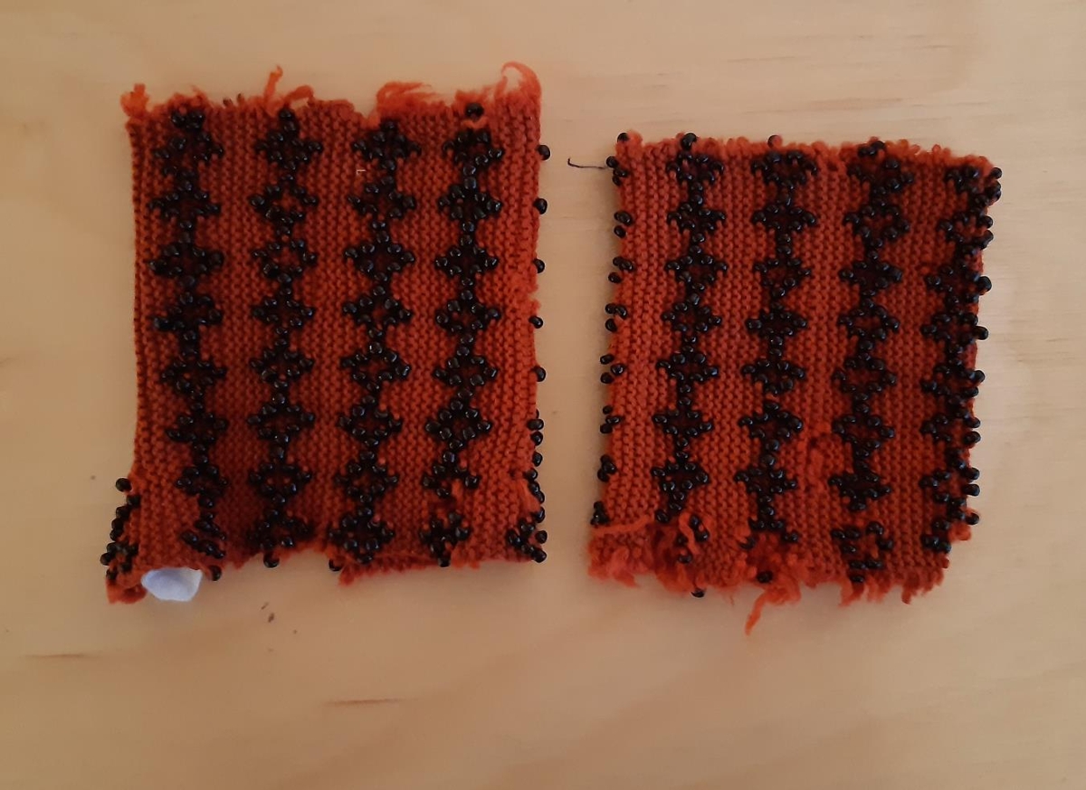 Handstúkur - A og B- Handstúkur. Ryðrautt ullarband með svörtum perlum. Prjónað með garðaprjóni. Peruprjón myndar samfellda tígla langsum. Saumað saman. 8 perlubekkir. Nokkuð slitnar enda mjög gamlar.