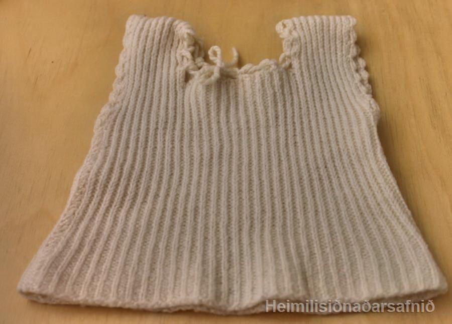 b) Ungbarnatreyja - Hvítt ullargarn. Prjónað með sléttu og brugðnu. Vélprjón. Snúra dregin í háls.