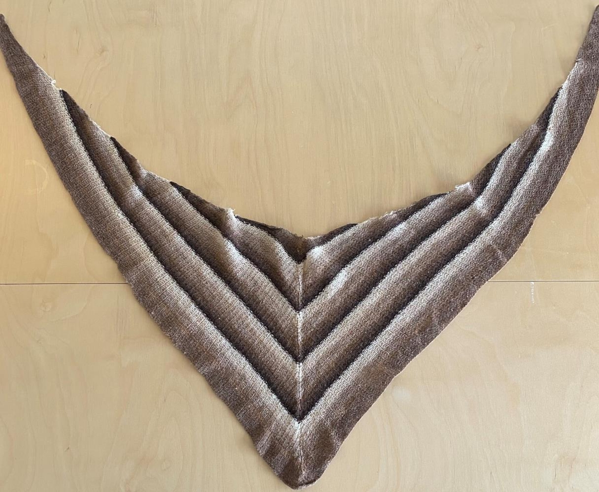 Þríhyrna úr fínu tvinnuðu íslensku bandi. Í sauða litunum, hvítum, sauðsvörtum og tveimur mórauðum. Hyrnan er í gömlum stíl, bundin fram fyrir. -