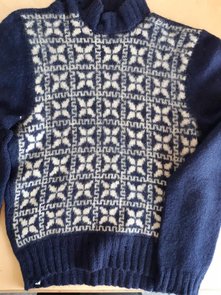 Blá peysa úr lopa með hvítu munstri að framan. Alexandersbekk og fjögurrablaða rós. Hneppt á öxl með þremur tölum. Tvöfaldur rúllukragi. Nokkuð þæfð.