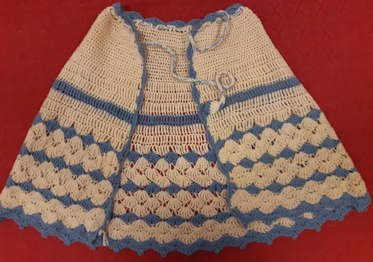 Herðasjal prjónað úr hvítu gefjunarbandi með bláum röndum. Heklað með bláu utan um, laufabekkur með pinnahekli. Í hálsmáli er heklað band og heklaður dúskur.